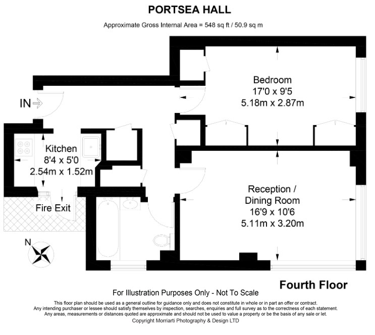 The apartment features a spacious reception room, a fitted kitchen, a double bedroom, and a bathroom, all complemented by 24-hour porterage for added convenience.
