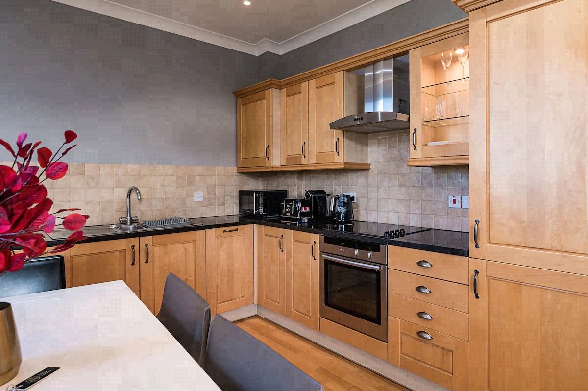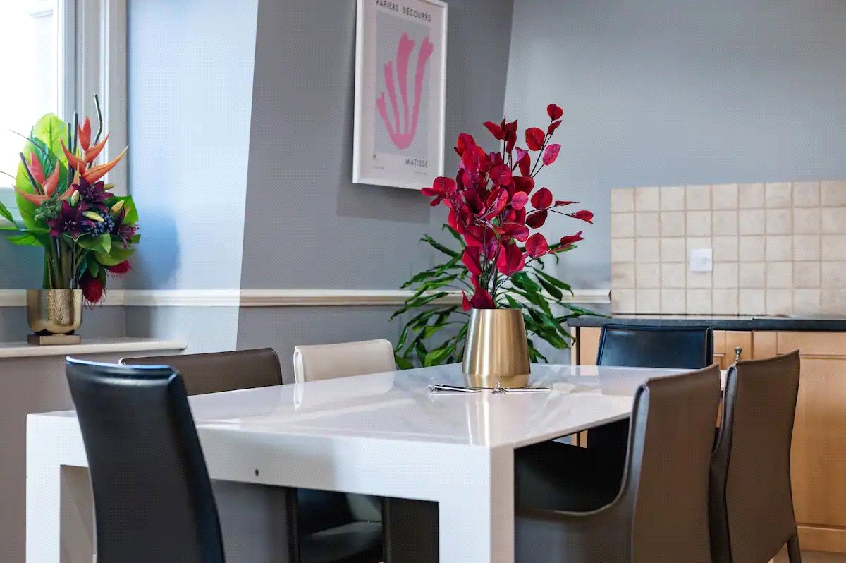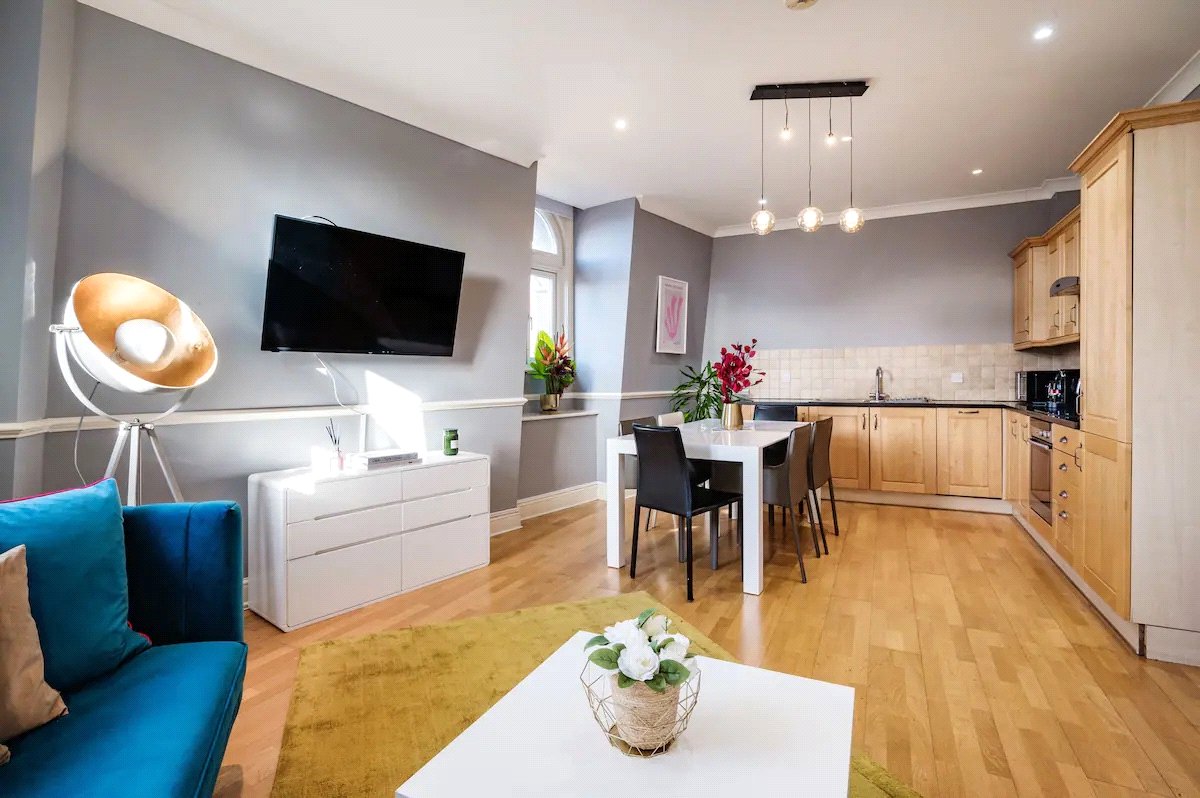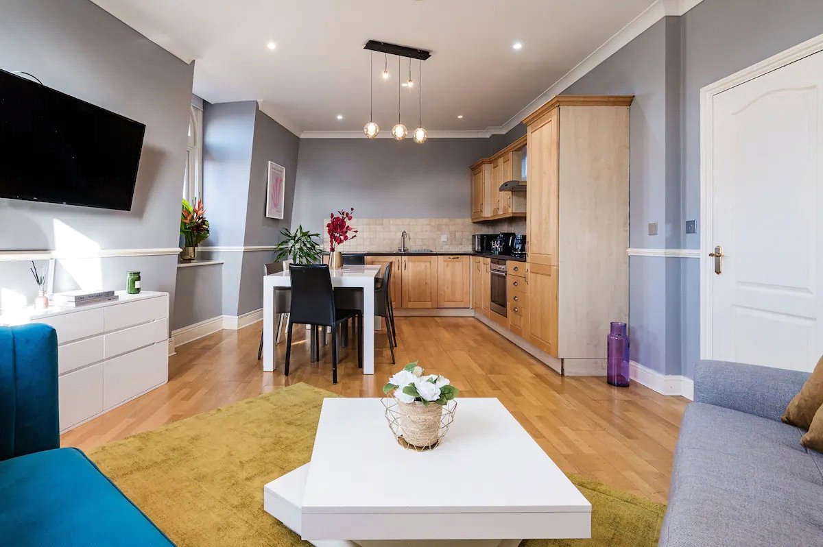 This spacious and attractively designed flat offers contemporary living with high-end amenities while retaining its historic charm. The open-plan living and dining area features large windows that let in plenty of natural light and provide breathtaking city views. The modern kitchen features high-end appliances, elegant cabinetry, and stunning surfaces.